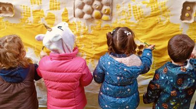 Hem gaudit de moltes propostes d’exterior: hem pintat amb volum, hem pescat rodanxes de llimona amb coladors, hem enganxat gomets, hem explorat joguines d’aquest color i hem jugat amb les ampolles sensorials. Els alumnes han explorat liurement circulant per totes les propostes, afavorint les relacions entre els infants i adquirint nous aprenentatges de forma transversal.