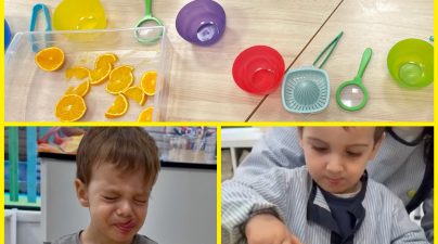A l’etapa de 1 a 2 anys els nens i nenes exploren i descobreixen a través dels sentits. Aquesta setmana fem una proposta d’experimentació amb taronges i llimones, de manera que treballem el tacte, el gust, la vista i l’olfacte. Manipulem, observem i tastem les llimones i taronges, fem suc amb un exprimidor… també fomentem l’atenció, la coordinació oculo-manual i el llenguatge.
