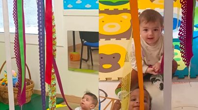 Aquest espai de l’aula afavoreix l’estimulació dels més petits i els incita a moure’s per intentar agafar les cintes de diferents colors i textures. Ens ha agradat molt!